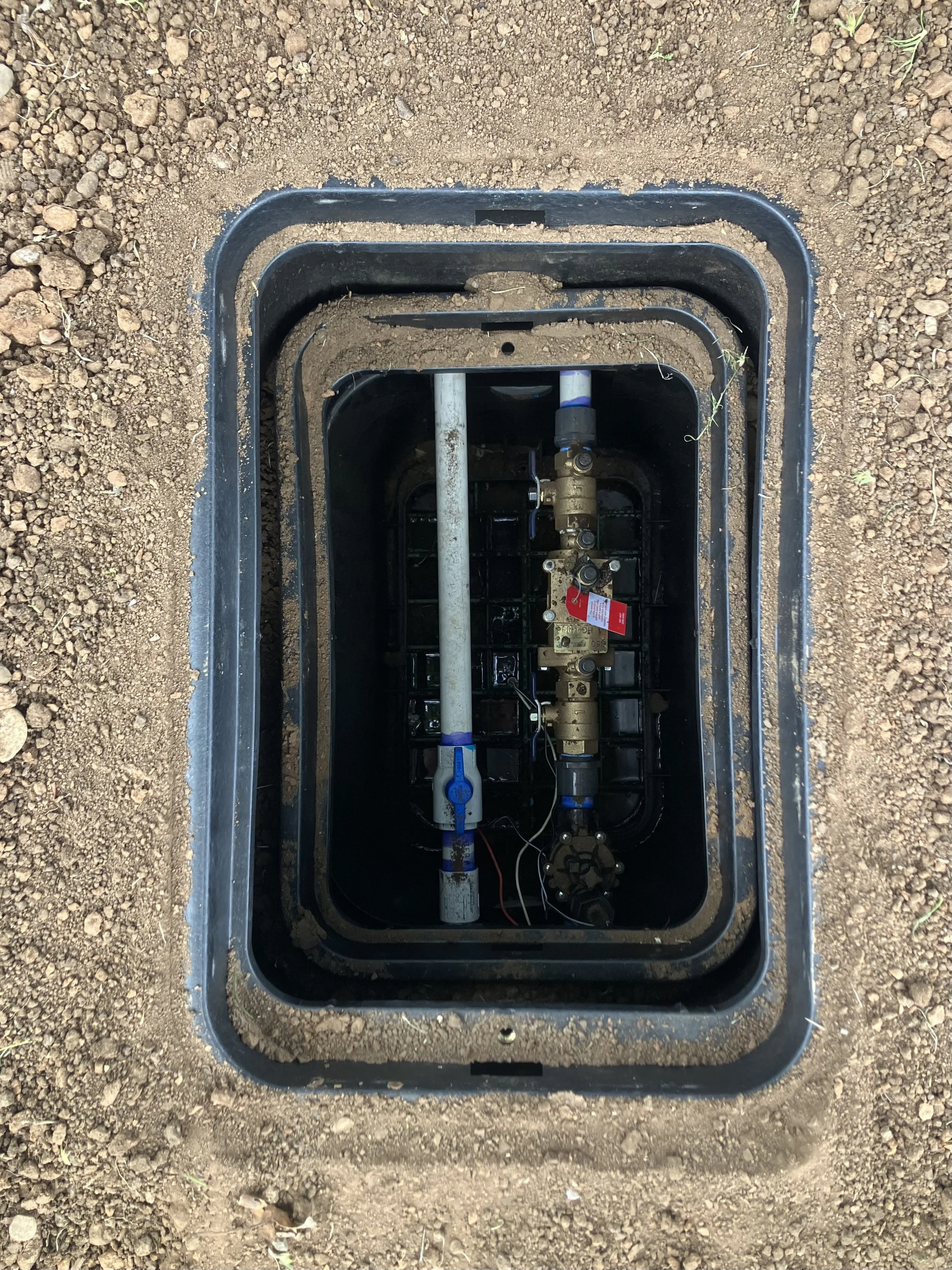 Shutoff valve and double check backflow device installed with box underneath and above. (Completed in Walnut Creek community)